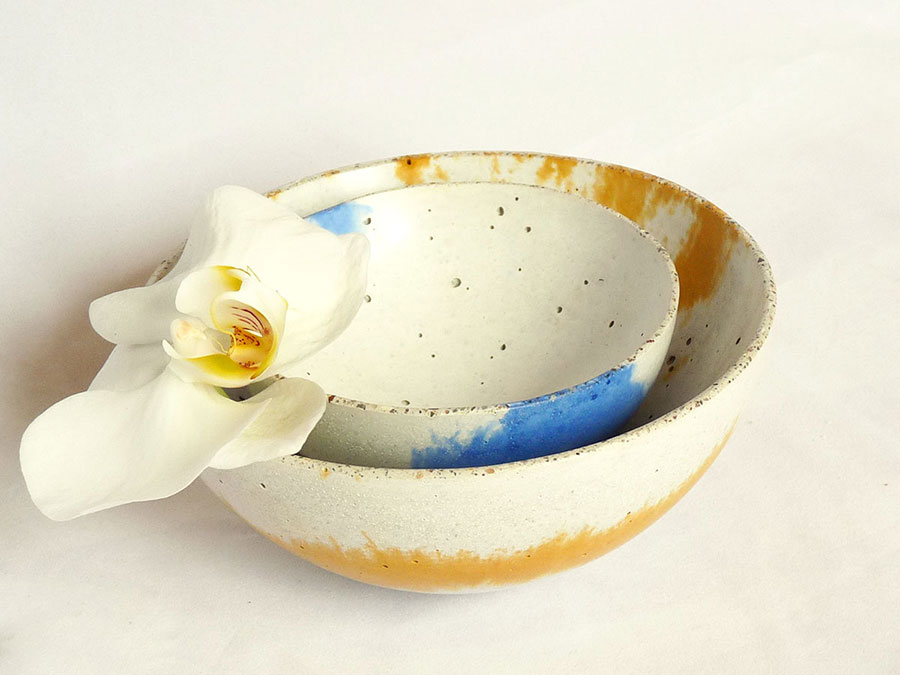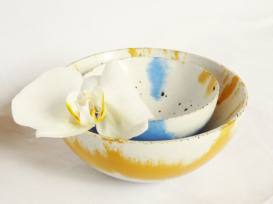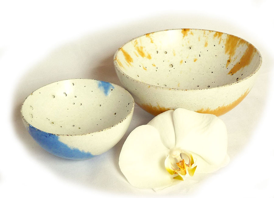 Kleine Unregelmäßigkeiten und Lufteinschlüsse sind charakteristisch für Beton und machen jede Schale zu einem Unikat. Bei der Verwendung von farbigem Beton entsteht eine wunderschöne mehr oder weniger stark ausgeprägter Marmorierung, welche beim Herstellungsprozess nicht gezielt beeinflußbar ist.