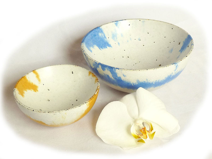 Kleine Unregelmäßigkeiten und Lufteinschlüsse sind charakteristisch für Beton und machen jede Schale zu einem Unikat. Bei der Verwendung von farbigem Beton entsteht eine wunderschöne mehr oder weniger stark ausgeprägter Marmorierung, welche beim Herstellungsprozess nicht gezielt beeinflußbar ist.