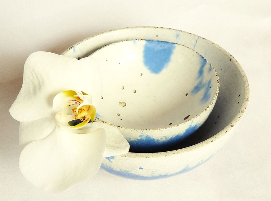 Kleine Unregelmäßigkeiten und Lufteinschlüsse sind charakteristisch für Beton und machen jede Schale zu einem Unikat. Bei der Verwendung von farbigem Beton entsteht eine wunderschöne mehr oder weniger stark ausgeprägter Marmorierung, welche beim Herstellungsprozess nicht gezielt beeinflußbar ist.