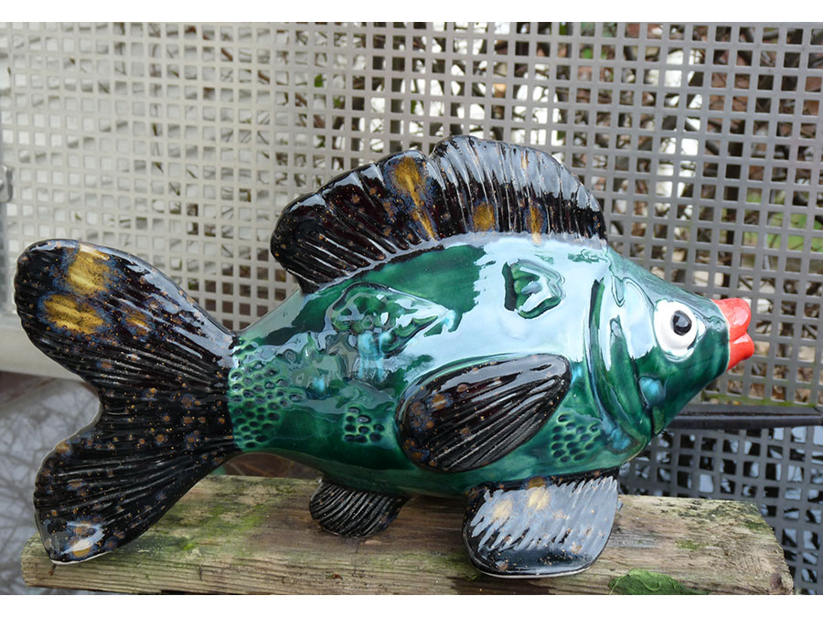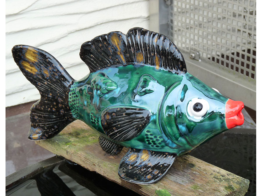 Wunderschöner großer Fisch zur Verwendung als Wasserspeier am großen Garten- oder kleinen Miniteich. Mit seinen großen Kulleraugen und seinem roten Kußmaul ist er DER Hingucker schlechthin.