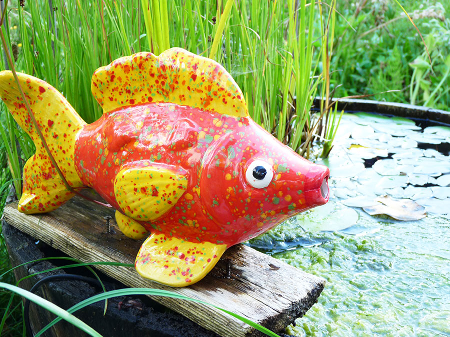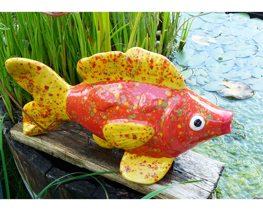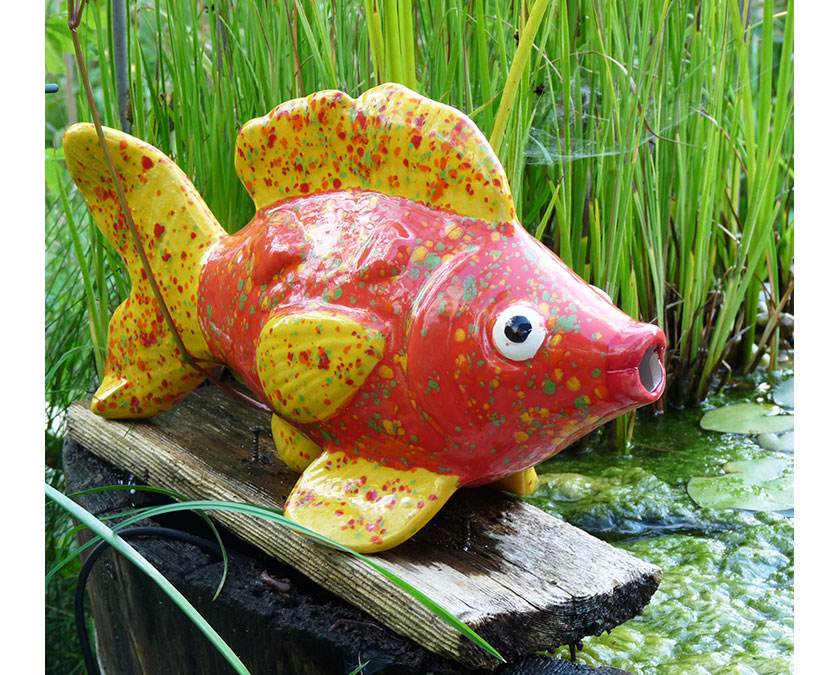 Wunderschöner großer Fisch zur Verwendung als Wasserspeier am großen Garten- oder kleinen Miniteich. Mit seinen großen Kulleraugen und seinem roten Kußmaul ist er DER Hingucker schlechthin.