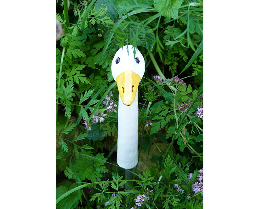 Der Mini-Gartenstecker Gans hat an der Unterseite ein ca. 1 cm großes Loch zur Aufnahme eines Metall- oder Holzstabs. So können Sie den Gartenstecker in gewünschter Höhe in Ihre Blumenbeete stellen. Schön sieht dieser Gartenstecker auch vor der Haustür aus, wenn Sie ihn zu zweit oder dritt in einen schön bepflanzten Blumenkübel stecken. Passen Sie die Länge des Stabs entsprechend der benötigten Höhe an.