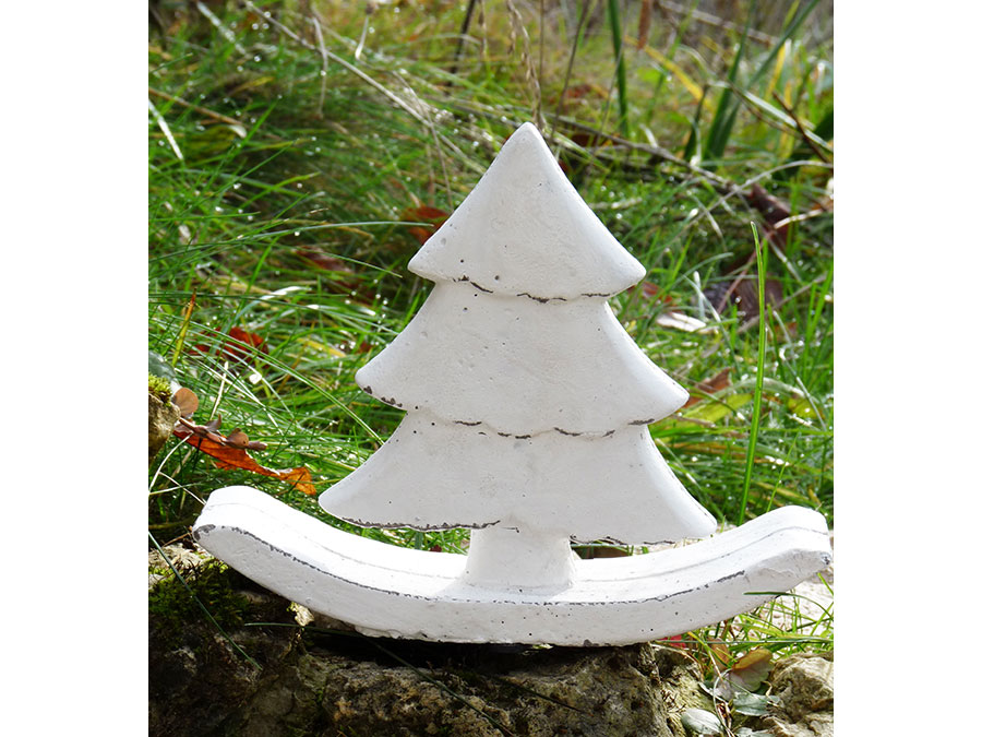 Der Baum ist aus Beton gegossen und weiß angemalt. Er steht auf einer Wippe.