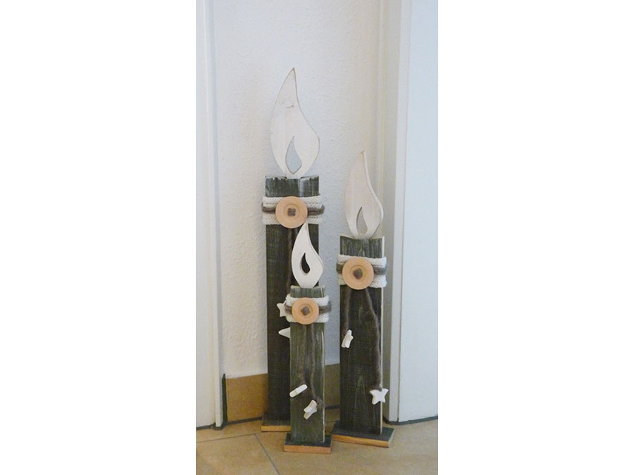Im Set oder alleine. Vor der Haustüre, auf dem Fensterbrett oder auf dem Boden. Diese schönen Kerzen aus Holz sind einfach traumhaft. Liebevoll dekoriert mit einer Kordel, Holzsternen und einem großen Holzknopf.