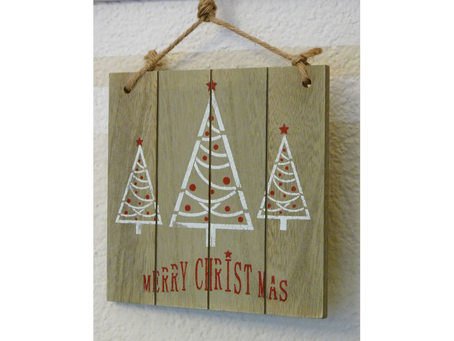 Schlicht gehaltenes Holzschild mit dem Schriftzug "Merry Christmas" und drei Tannebäumen
